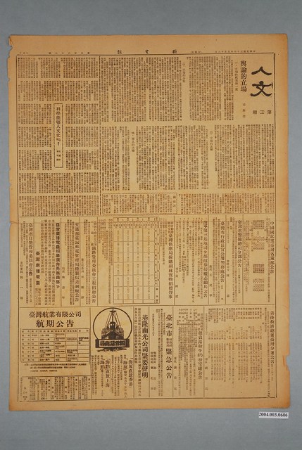 此為一紙質報紙,以黑色字體印刷,本物件為1947年(民國36年)5月16日發行之《臺灣新生報》第568號,此物件為單張單面,共兩版,內容計有〈維持同業最低生活,金銀公會請求配金,派員分赴京滬兩地陳請,市商會開理監事聯席會〉、〈基隆進出口貨物四月份之統計,二商輪貨運頻繁定期開航〉、〈萬國貿易公司擬舉行國貿展覽會〉、〈新竹公地出租暫行辦法〉、〈花蓮公地放租委會議決三事〉、〈臺北米價下跌〉、〈匯款調撥費用增高,臺行匯水稍有提增〉、〈交通部臺灣郵電管理局通告〉、〈臺北市政府公告〉、〈基隆市政府公告〉、〈臺中縣政府試驗船徵求業者合作漁業招標公告〉、〈臺南縣警察局公告〉、〈高雄港務局港灣工程事務所標售廢鐵公告〉、〈輿論的立場〉(司馬達)、〈科學能夠人文化嗎?(杜威作 禾辛譯)、〈中國國民黨臺灣省黨部通告〉、〈臺灣省警備總司令部公告〉、〈臺灣省行政長官公署警務處公告〉、〈海軍第三基地司令部招募接鑑志願兵公告〉、〈聯合勤務總司令部臺灣供應局採購副秣實物招標啓事〉、〈臺灣省行政長官公署交通處鐵路管理委員會工程招標公告〉、〈交通部臺灣郵電管理局標製信差制服公告〉、〈臺灣省日僑管理委員會公告〉、〈善後救濟總署臺灣分署公告〉、〈善後救濟總署臺灣分署標賣湯粉牛奶粉空罐公告〉、〈臺北市財政局警察局緊急公告〉等。 《臺灣新生報》創刊於1945年10月,是戰後初期由臺灣省行政長官公署宣傳委員會所經營的官方報刊,其前身為1944年,臺灣總督府整併島內六間報社所發行的《臺灣新報》。《臺灣新生報》最初由李萬居主導,雖屬官營報紙,但仍忠實反應民意,在二二八事件前夕,官民衝突漸深之際,新生報屢次發表告誡官方約束權力之言論。二二八事件之後,李萬居職權遭架空,辦報人員亦多被肅清,《臺灣新生報》成為更加偏向政府的報紙。 中華民國政府於1945年接收臺灣之始,即派出「中央宣傳部」整頓臺灣報業,撤廢日治時期管控報紙的許可制度,改為登記申請制,管制的解除使得戰後初期的辦報風氣大盛。後由於民間報刊對於接收後的行政長官公署多有批判,於是在二二八事件之後,政府開始嚴格控管報紙,在戒嚴開始後更以資源節約、端正文化等理由施行「報禁」。(王天濱,2002。154-170)