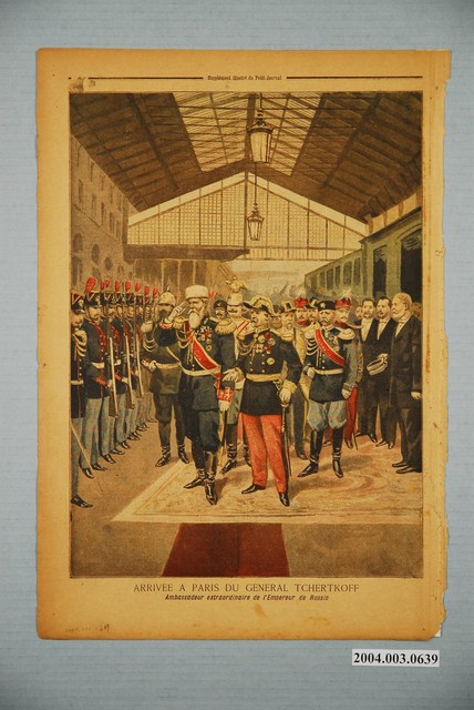 此物件為1895年1月6日發行的法文日報Le Petit Journal(小日報),此物件封面為1895年甲午戰爭下上海的景象,另外一面為1895年俄國將領以大使的身分抵達巴黎,在此之前於1894年法國與俄國正式簽訂「法俄同盟」。 Le Petit Journal(《小日報》)是一份法國報紙,發行於1863年,由來自法國波爾多地區的銀行家莫伊茨‧波利多‧米洛(Moïse Polydore Millaud)。《小日報》以價格低廉,內容通俗且刊載浪漫小說、人情味故事為特色,讀者眾多,成為世上第一份日銷超過百萬的報紙。《小日報》自1884年起增設每週副刊,以彩色石印版畫的形式紀錄世界重大事件。《小日報》的新聞插圖,以法國觀點對於1891至1911年間,關於中國近代化與對外開放的重大歷史時刻,提供了具體紀錄。 《小日報》為法國在19世紀末出現的「廉價報紙」之一,「廉價報紙」為法國當時的新型報紙之一,原有的報紙形態在經濟來源上依賴政府、政黨,並且內容上主要以政論文章為主,而「廉價報紙」則是以發行、廣告為其經濟收入來源,兩種報紙各有消費者,兩類型報紙在當時的法國並存,其中「廉價報紙」的代表為《小巴黎人報》、《小日報》