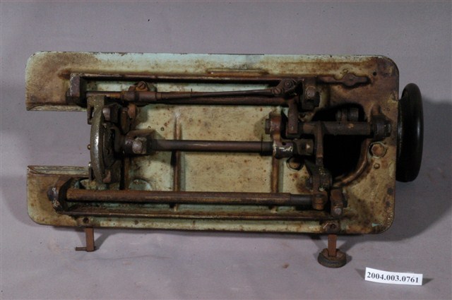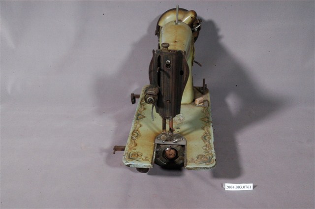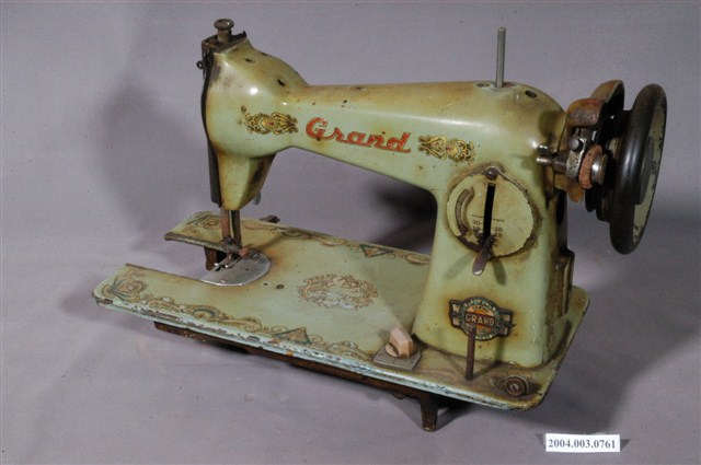 本文物為Grand牌手搖式縫紉機,主要為金屬材質,機面有著金色、綠色線條的圖案。縫紉機表面有多處的生鏽與污漬。將線軸放入右側的長棍裡,再將線固定在左側的機台上,就可轉動黑色握把,自行調整縫紉速度。1970年英國人湯瑪斯‧聖特(Thomas Saint)為提高製鞋效率設計手搖裁縫機,在多次的改良之下,時至1853年多數家庭使用之腳踏裁縫機才出現。而傳統家庭中的縫紉工作多由女性擔任,因此縫紉機出現反映女性生活與科技互動,所產生工作型態之改變,也成為當時必備的嫁妝品。