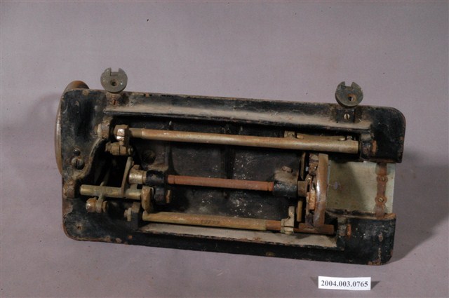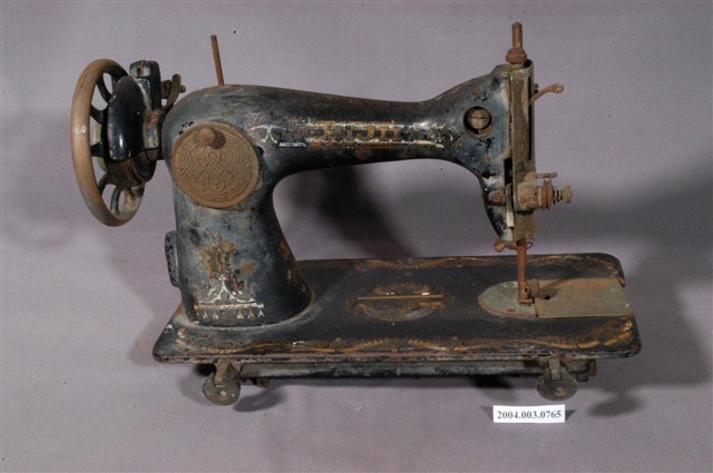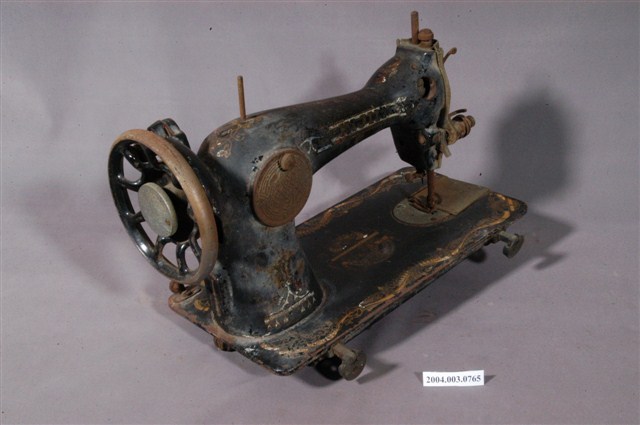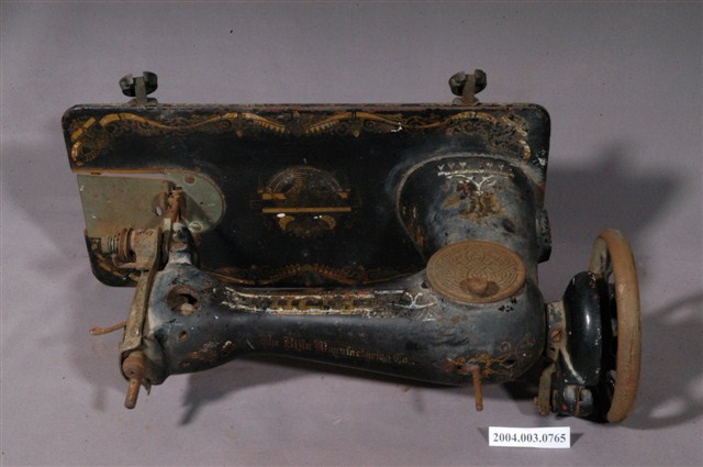 本文物為手搖式縫紉機,主要為金屬材質,以黑色為底,機台上有著金色的紋路圖案。縫紉機表面有多處的生鏽與污漬。將線軸放入右側的長棍裡,再將線固定在左側的機台上,就可轉動握把,自行調整縫紉速度。1970年英國人湯瑪斯‧聖特(Thomas Saint)為提高製鞋效率設計手搖裁縫機,在多次的改良之下,時至1853年多數家庭使用之腳踏裁縫機才出現。而傳統家庭中的縫紉工作多由女性擔任,因此縫紉機出現反映女性生活與科技互動,所產生工作型態之改變,也成為當時必備的嫁妝品。