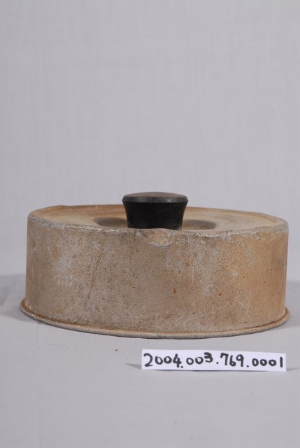 本件外蓋為勝利牌金屬保溫瓶部件之1,外觀呈霧面金屬灰色略帶茶褐色,通身以鋁金屬製作。頂面中心內凹,帶有黑色電木圓鈕,由內側以螺絲固定,蓋頂與蓋身作垂直轉折,蓋緣處向外拗折作圓唇。本件為保溫壺最外層的蓋子與壺身口緣作套合式開闔。