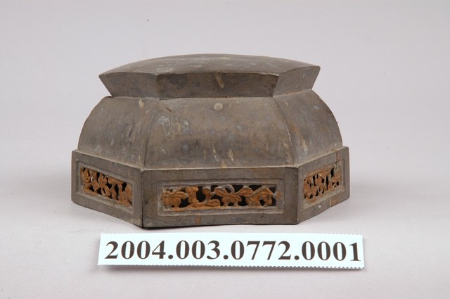 本文物為錫製粉盒蓋,六角形形狀,外觀有花紋圖案的鏤空雕刻,並塗上金色顏料,相當別緻。粉盒表面有多處的生鏽與污漬。為當時婦女用來放胭脂粉的容器。女性臉上的妝扮為其對特定生活之想像,相對地女性之美也時常受限於社會傳統價值觀,妝扮女性的化妝品及其附屬產品,則體現了社會審美觀和科技的變動。