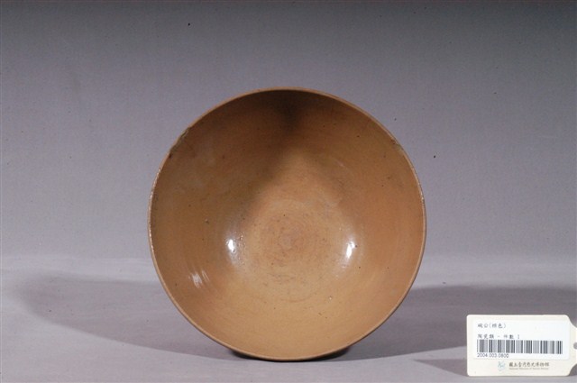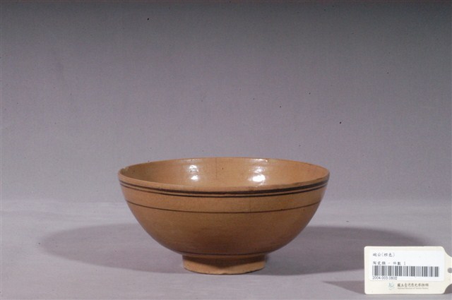 棕色線紋碗,敞口,弧壁,圓腹,底有圈足,採壓模成形、以釉料彩繪裝飾後高溫燒製而成。除圈足底外全器施棕色釉,口沿有二處碰撞缺口,碗內壁素面無紋,碗外壁緣口處飾深棕色雙線弦紋,腹部上半三分之一處與近底部各飾一道深棕色單線弦紋。紋樣與底色同為棕色調,頗具整體感。