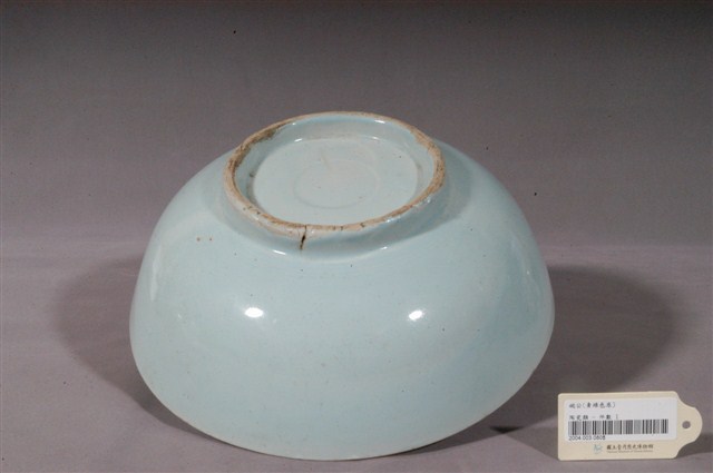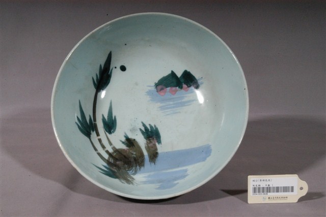 天青釉彩繪竹葉山水紋碗公,為形制較大的湯碗,民間俗稱「碗公」。此件碗公以模製成形,敞口,弧壁下收,碗身寬大且深,圓腹,底有圈足,圈足有胎裂紋,碗底心壓印同心圓形與細弦紋造型,圈足上方另有數道細刻弦紋,增加造型變化。全器除圈足底外施天青色釉,表面可見氣孔與雜質斑點。碗外壁素面無紋,圈足可見一道明顯裂紋,碗心以藍、綠、黑、粉紅等釉彩描繪竹子與山水風景,幾筆大片藍色色塊表現水面,左方竹子高聳豎立,與右上方的遠山前後呼應。整體畫面構圖立體,筆法簡單俐落,色彩搭配合宜。
