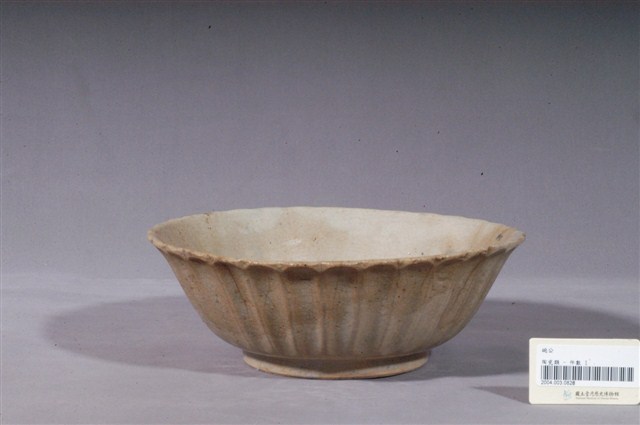 彩繪山水紋菱花口碗,為戰後初期家庭常見之餐飲用器,以模具成形,並於白色長石釉上裝飾彩釉之後,高溫燒成。敞口,弧壁,底帶圈足,碗口與碗身作菱花瓣造型,共三十二瓣,整個碗猶如一朵盛開的花朵,外底心特意壓模數道細弦紋造型,增加變化。全器施極淡的藍色釉,圈足底露胎,胎色米白。碗身一側被使用過的汙漬覆蓋而呈褐黃色,且可見細密開片,與自口沿向下延伸的長裂痕。碗外壁素面無紋,有幾個施作時釉料低下所造成的藍色斑點,主要圖案位於碗心及碗內壁一側,以青、綠、褐彩顏料描繪山水風景,屋舍、綠樹倚傍清水,二艘孤舟遺世獨立,遠山巍峨