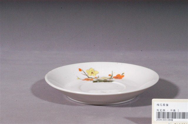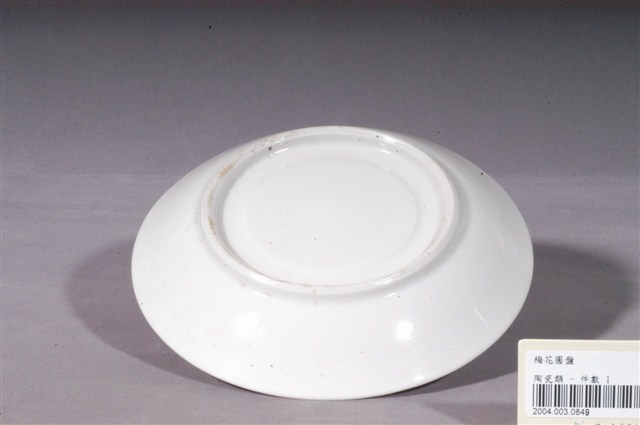 釉上彩轉印梅花紋圓盤為高溫燒製、模具成形,圓唇,口沿外侈,斜弧壁下收至圈足,圈足徑大,大於口徑一半的大小,圈足亦上釉,僅幾處微微露胎,透出來的胎色略帶黃,胎質細緻。全器滿施白釉,釉面光滑瑩潤,呈色飽滿潔白,器表有幾處氣孔,是因高溫燒製導致而成的現象。盤外壁素面無紋,僅盤內有紋樣裝飾。盤心處有一圓形凹槽,凹槽周圍以彩釉轉印繪兩株梅樹。梅樹以凹槽為地、盤緣處為天的方向描繪,樹上兩種顏色的梅花,幾朵盛放、幾朵花苞,層次井然,構圖活潑。本件作品的圓形凹槽應是配合杯或碗所做的卡榫,是兩件一組的作品中盛放器具的底件。