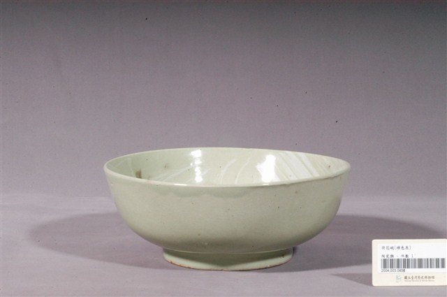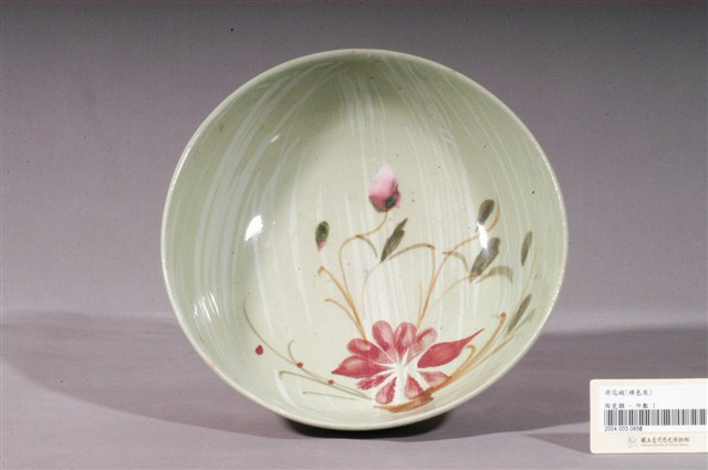 1.彩繪花卉紋碗公,敞口,弧壁下收,圓腹,底有圈足,以模製成形,施釉彩繪裝飾後高溫燒成。全器施淡湖水綠釉,器表略有氣孔,圈足底露胎,胎色灰褐。碗外壁素面無紋,外碗心有一筆紅色線條,應為彩繪時不小心畫上所留下,主要紋飾繪於碗內壁,一朵盛開的大紅花聚焦主視覺,後方粉色花苞營造出層次感,綠、褐色彩描繪枝葉,碗面刷毛白泥輕成弧形線條紋,增添變化。2.碗的形制有分較大的湯碗和較小的飯碗,湯碗臺灣民間俗稱「碗公」,多用來盛裝菜湯,是臺灣家庭中常見的民生瓷器。