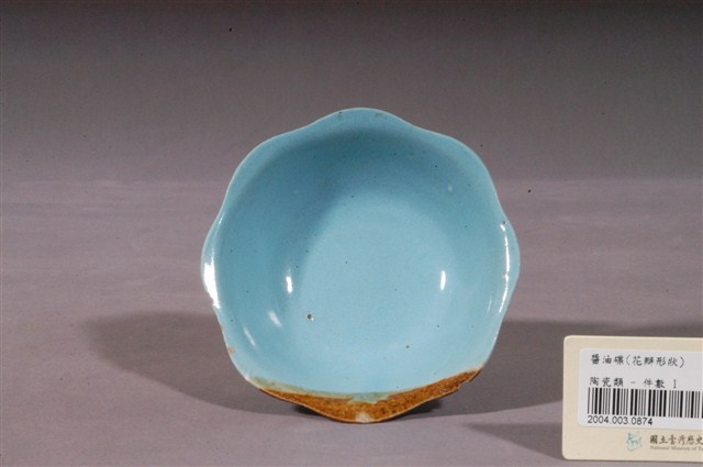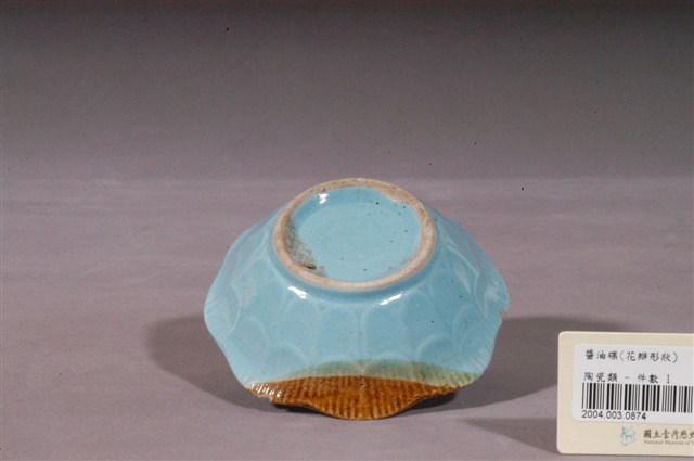 青瓷醬釉花形碟為高溫燒製且由模具成形,薄圓唇,平口,口沿外侈,淺圓腹,斜直壁下收,碟底緣方折,平收至圈足,圈足,圈足露胎,胎色白偏黃,胎質略微粗糙,圈足底略有窯沙沾黏。器形做波浪狀花口,外壁以模具塑出雙層花瓣般的效果,近口緣處的花瓣內以數條陰刻平行線條作為花瓣內之裝飾。全器施青色釉,釉面瑩潤,呈色較淺且偏天藍色,釉色均勻,不過器表有些許因高溫燒製導致而成的氣孔,因而略顯得釉面較為粗糙。器形一端施較深的褐色釉,發色與施釉皆不均,多處透露出底下的青色釉,並有因溫度過高導致的脫釉痕跡。器內壁素面無紋飾,僅以釉色變化為主。
