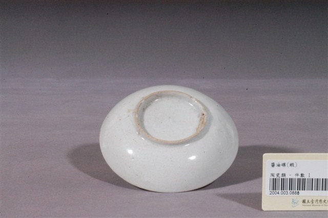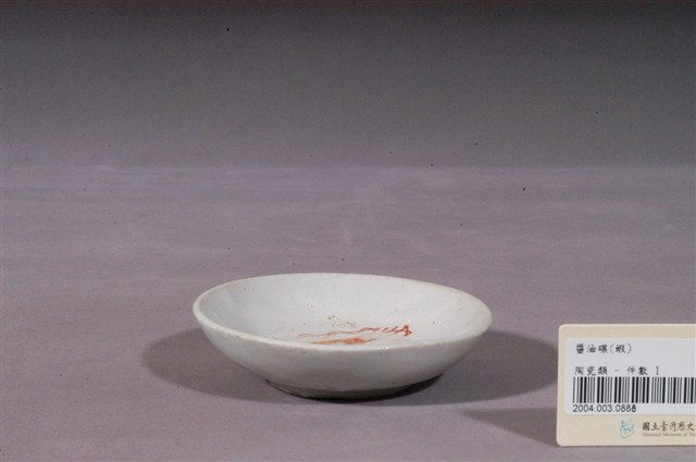 1.印繪白瓷紅蝦圓碟圓唇,平口,淺腹,弧壁下收至圈足,圈足露胎,胎色白皙,胎質略粗,圈足周圍略有窯沙沾黏。全器施白釉,釉色微微泛青,釉面光潔,不過器表有許多因高溫燒製導致而成的氣孔,釉面較不平整。碟外壁素面無紋飾,碟心轉印一紅色大蝦紋樣,不過此件作品中的蝦紋有較嚴重的磨損,並不能清楚見到整體的表現。由部分紋飾依然可見是以模具施紅釉勾勒出蝦紋的輪廓,再以同樣的釉料為蝦身填彩。紋飾的紅釉呈色略淺,發色略有不均。2.尺寸較小、器深較淺的碟子俗稱「醬料碟」,一般用來放置調味料,也可當作放置母匙、湯匙等的小碟子。