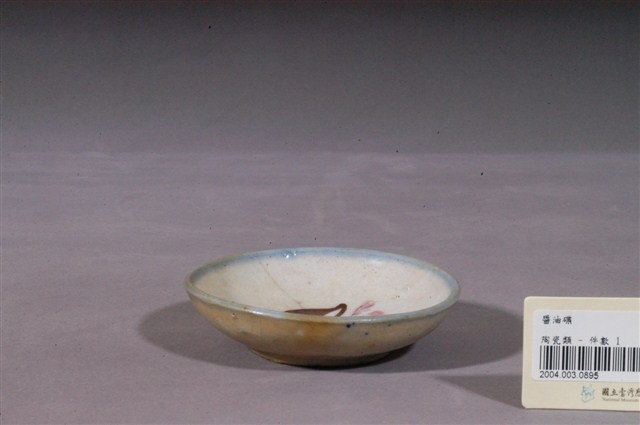 彩繪花卉紋圓碟圓唇,平口,淺圓腹,弧壁下斂至圈足,圈足徑較大,圈足露胎,胎色白中略帶黃,胎質略微粗糙,厚胎。全器施乳白色釉,釉面光潔,呈色較暖且不均;不過器表有許多因高溫燒製導致而成的氣孔,且釉面有因高溫而變色的痕跡,釉面滿佈開片,圈足處則有脫釉痕跡。器外壁素面無紋飾,口沿處以鈷藍釉施罩一圈圈紋,青花發色較淡,呈色均勻。碟心以褐色釉、粉紅釉、綠釉繪紋樣,表現生長於地面的花草以及遠方的飛鳥。整件作品簡單樸實,稚拙可愛。