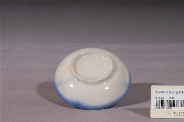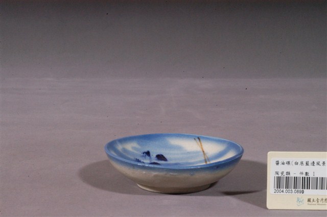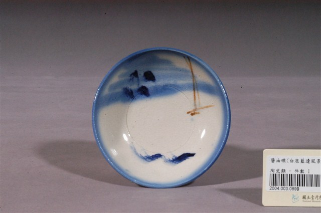 1.這件青花山水紋圓碟,是北投窯廠產製的日用陶瓷器皿。圓唇,直口,弧壁,寬淺圈足。胎厚,由圈足可見胎土呈乳白色。通體施釉,以青花為主色調,釉面有細微開片。口沿以淺藍釉填繪弦文一周,內壁以青花搭配褐釉色料描繪遠山及海景圖樣。繪彩時可見青花有濃淡之分,具暈染漸層的效果。2.日治時代,日人進入北投經營窯業,也將日本陶畫的描繪特色引進臺灣。使用大筆填繪圖案,讓鈷料產生濃淡、暈染的效果,即是日本青花瓷的特徵。這種讓青花產生漸層的筆法效果在臺灣常見於描繪山水紋、海景圖題材上,且描繪的筆幅較寬,呈現較粗略、奔放的風格。