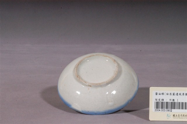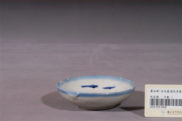 1.這件青花山水紋圓碟,是北投地區產製的日用陶瓷。圓唇,直口,弧壁,淺圈足,圈足微微外撇、塗青料一圈。口沿有許多缺口、傷痕。由圈足露胎處和口沿缺口可見胎土呈乳白色,胎質細膩。通體施釉,釉面有大面積開片紋路,碗壁有積釉痕跡。彩繪以青花為主色調,內壁以青花搭配褐釉色料會遠山及海景圖樣,圖案簡略粗率,趨於抽象。表現海洋的青花釉料發色較淡,而表現遠山及海岸岩群的青花發色較濃。雖以單色釉為主要色調,但盤面青花的濃淡之分仍讓彩繪頗富層次感。2.日治時代日人進入北投經營窯業,也將日本陶畫的描繪特色引進臺灣。使用大筆填繪圖案,讓鈷料產生濃淡、暈染的效果,即是日本青花瓷的特徵。這種讓青花產生漸層的筆法效果在臺灣常見於描繪山水紋、海景圖題材上,且描繪的筆幅較寬,呈現較粗略、奔放的風格。