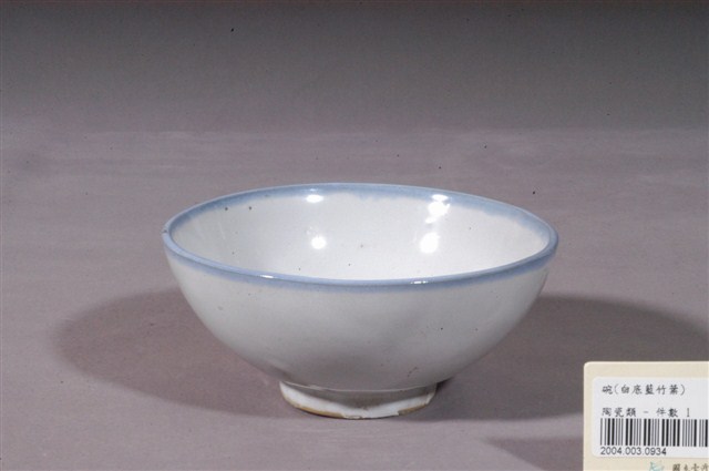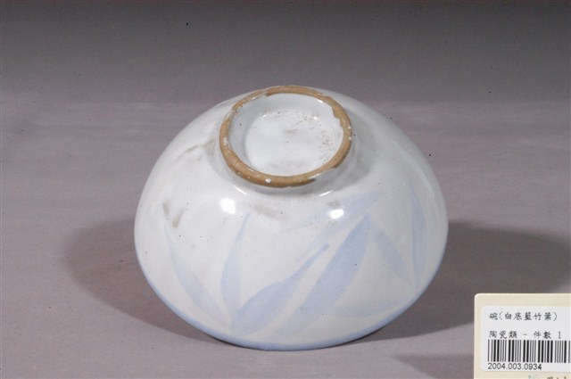 1.青花竹葉紋碗,敞口,弧壁下收,圓弧腹,底有圈足,以模具成形,施鈷料彩繪裝飾後高溫燒製而成。全器施白釉,釉色略帶乳白色調,釉層分佈不均,碗外壁下半與碗底心幾處釉層較薄的地方略透胎土褐色,圈足底與外側部分不及釉。口沿以青色鈷料塗滿,碗內壁素面無紋,碗外壁一側以青花鈷料裝飾竹葉紋,利用釉色深淺創造立體感,整體色彩淡雅清新。2.碗的形制有分較大、臺灣民間俗稱「碗公」的湯碗和形制較小的飯碗。本物件屬於形制較小的飯碗,碗壁上手繪的竹葉紋為鶯歌碗盤中常見的紋飾,從日治時期一直沿用到光復以後,竹子為松、竹、梅歲寒三友之一,象徵著文人的高尚志節。
