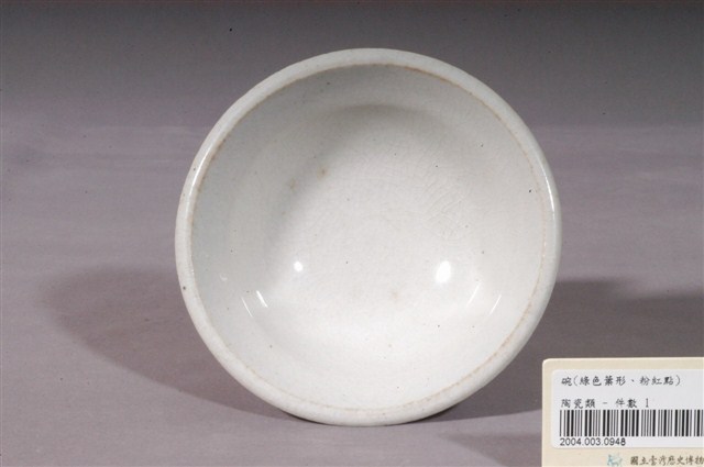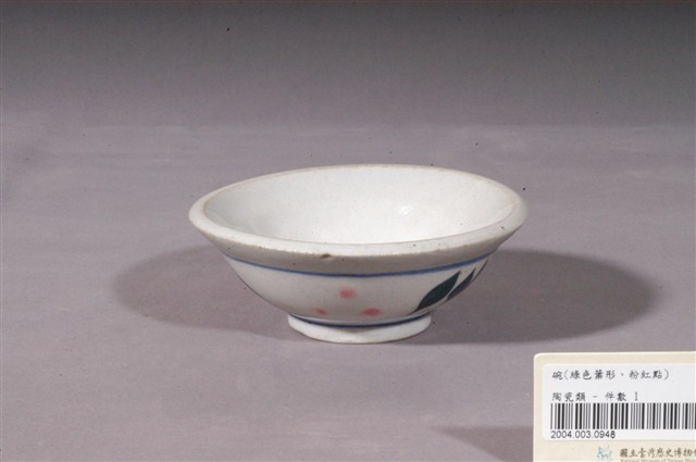 1.青花粉彩葉紋生意碗,撇口,折沿,碗外壁口緣下方作一內凹折痕,折痕以下呈圓弧形下收,底有圈足。以模具成形,施釉彩繪裝飾後高溫燒成。全器施白釉,圈足底露胎,胎為白色。碗內壁素面無紋,碗外壁腹部上下以鈷料各裝飾一道青花弦紋,上弦紋有一段已磨損消失,其間彩繪黛綠葉片與粉色圓形小花。碗內外壁皆可見細小開片,口沿留有一圈汙漬痕,並有一小缺角。2.生意碗為小吃攤喜愛使用,業者稱為「生意碗」的小吃碗,常見於滷肉飯、肉圓、肉羹等小吃攤。它的形制相當特別,通常胚體厚重,外折的口沿使碗面看起來比一般飯碗大,但碗的下半部向內收縮,碗身也淺,因此在視覺及重量上會讓客人覺得食物份量很多,但實際盛裝的並不多。