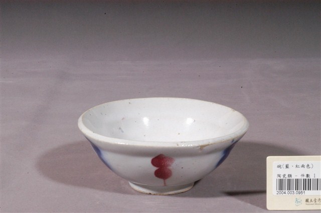 1.紅藍彩繪印花生意碗,撇口,折沿,碗外壁口緣下方作一內凹折痕,折痕以下呈圓弧形下收,底有圈足。以模具成形,施釉彩繪裝飾後高溫燒成。全器施白釉,釉色略帶乳白色調,表面有明顯氣孔與雜質斑點,圈足底露胎,胎色米白。碗內壁素面無紋,碗外壁採用彩繪印花技法,將花紋刻在印模上,沾染紅色和藍色釉料,間隔蓋印出點狀與細線組成的規則紋飾。2.生意碗為小吃攤喜愛使用,業者稱為「生意碗」的小吃碗,常見於滷肉飯、肉圓、肉羹等小吃攤。它的形制相當特別,通常胚體厚重,外折的口沿使碗面看起來比一般飯碗大,但碗的下半部向內收縮,碗身也淺,因此在視覺及重量上會讓客人覺得食物份量很多,但實際盛裝的並不多。