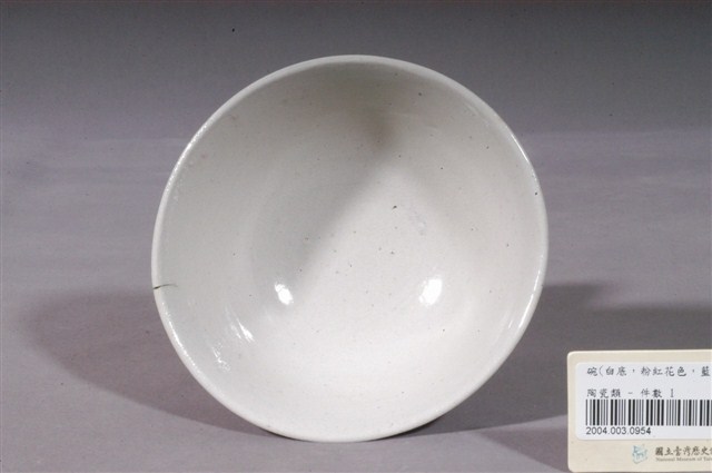 手繪青花花卉紋碗薄圓唇,敞口,口沿不平整,弧壁,圓腹下斂至圈足,圈足徑適中,足壁較直且稍高,圈足與地接觸面刮釉露胎。胎色白中帶灰,胎質略為粗糙。全器施白釉,呈色乳白,色澤瑩潤。內壁素面無紋,以模具壓出小顆凸起狀作壁面質感變化。紋飾主要繪於外壁器腹,以鈷藍釉和粉紅釉搭配做梅花紋飾,紋飾形成一帶狀,青花發色較濃重,略有不均。圈足周圍以褐色釉繪一較粗的圈狀紋飾。器底、碗內壁可見許多氣孔,是因高溫燒製形成的痕跡。口沿處則有一經使用形成的裂痕。