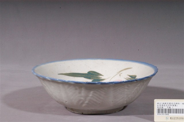 彩繪花卉紋花口碗高溫燒製,並以模具成形。薄圓唇,敞口,弧壁,圓腹,碗底較淺且寬,大圈足,圈足露胎,胎色白中帶灰,胎質細膩但略有雜質。全器施白釉,呈色白皙,帶點暖黃色調,色澤瑩潤,器表有些微因高溫燒製導致的氣孔。口沿作波浪花口,並施罩一圈鈷藍釉,發色均勻。外壁沒有手繪紋飾,以模具壓印多種幾何狀紋樣裝飾,增添壁面變化。主要的花卉紋飾繪於碗內壁一側,並擴展至碗心。整體以黃、粉紅兩色釉描繪兩朵盛開的花朵,並以黛綠釉繪出葉片,使構圖更有變化。紋飾的釉色搭配鈷藍釉,整體風格雅緻清新,同時亦是民間常見的釉色選擇。