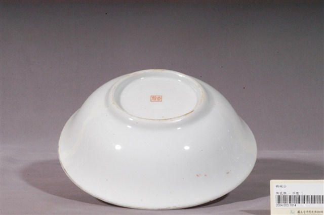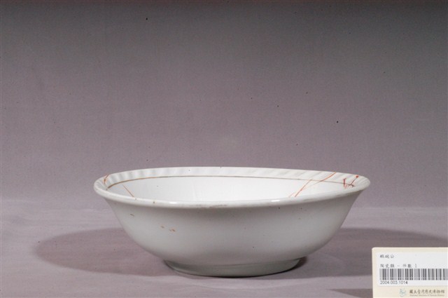 白瓷紅蝦大碗圓唇,口沿外敞,弧腹,腹寬,弧壁下斂至圈足,圈足徑較大,足底露胎,胎色稍深,胎質細緻。口沿外敞處作波浪狀壓紋,呈花口貌,波狀壓紋下方繪一金色弦紋裝飾。全器施白釉,釉色潔白光滑。碗外壁素面無紋,主要紋飾繪於碗心,以紅釉繪一大蝦。蝦子呈現手法較為圖案化,紅釉勾勒身形,蝦尾處較少描繪,並在背脊處以紅釉加強填彩,增添蝦身立體感。蝦紋在印繪時應是模板移位,蝦背上的填彩覆蓋到蝦尾的表現。蝦紋背後以幾筆金釉彩繪線條,增添畫面動感,活潑構圖。圈足內帶有「奇龍」款識。