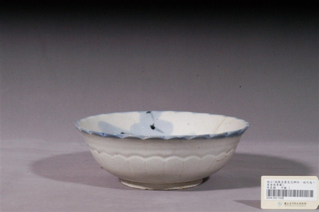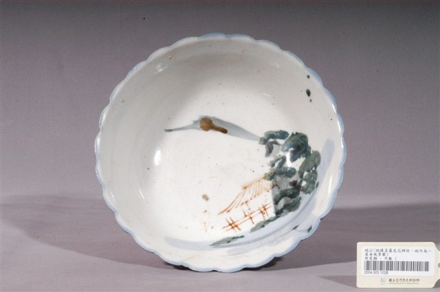 彩繪山水景緻花形碗以模具成形且高溫燒製而成。侈口,弧壁,淺圓腹,大圈足,圈足露胎,胎色略帶灰,胎質略為粗糙。圈足因刮釉因此留下凹凸不平的痕跡,圈足底較不平整。全器施白釉,呈色帶青色調,釉面光潔,器表略有氣孔。口沿施一道鈷藍釉,並向外開展的波浪花口狀,共三十二個波狀起伏,器外壁腹亦有一道同樣數量的波浪紋,沿著波浪紋向下延伸出縱向的稜脊。主要紋飾以碗內壁的圖案為主,以深淺的鈷藍釉、淺黃褐釉等為主要色調,描繪湖水、遠山以及岸邊人家景緻。紋樣的整體構圖簡潔,用筆隨性灑脫,僅對小屋作細節描繪,清淡雅致,意境清幽。整