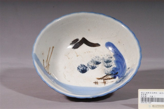 彩繪山水景緻花形碗以模具成形且高溫燒製而成。侈口,弧壁,淺圓腹,大圈足,圈足因刮釉因此留下凹凸不平的痕跡,圈足底較不平整。全器施白釉,呈色帶黃,釉面光潔,器表略有氣孔。口沿施一道鈷藍釉,並向外開展的波浪花口狀,外壁沿著花口的波浪紋向下延伸出縱向的稜脊,中間有一道繩紋,繩紋以下則有斜線延伸至碗底,使得整件作品由外側看起來像是模擬出木桶般的效果與造型。主要紋飾以碗內壁的圖案為主,以深淺的鈷藍釉、淺黃褐釉、綠釉等為主要色調,描繪湖水、遠山、飛鳥以及岸邊人家景緻。紋樣的整體構圖簡潔,用筆粗曠且隨性,遠山及綠樹以簡