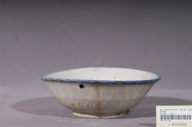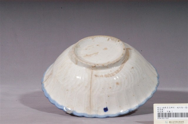 彩繪山水景緻花形碗以模具成形且高溫燒製而成。侈口,弧壁,淺圓腹,大圈足,圈足露胎,胎色略帶灰,胎質略為粗糙。圈足因刮釉因此留下凹凸不平的痕跡,圈足底較不平整。全器施白釉,呈色帶黃,釉面光潔,器表有數個氣孔。口沿施一道鈷藍釉,並向外開展的波浪花口狀,器外壁腹的紋路分為上下兩部分,上半部為直條紋,下半部為曲線紋。外壁有裂痕,泛黃等使用痕跡。主要紋飾以碗內壁的圖案為主,以深淺的鈷藍釉、淺黃褐釉等為主要色調,描繪湖水、遠山以及岸邊人家景緻。紋樣的整體構圖簡潔,用筆隨性,簡化各種景色的造形,僅對小屋作細節描繪,清淡
