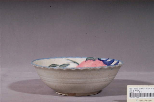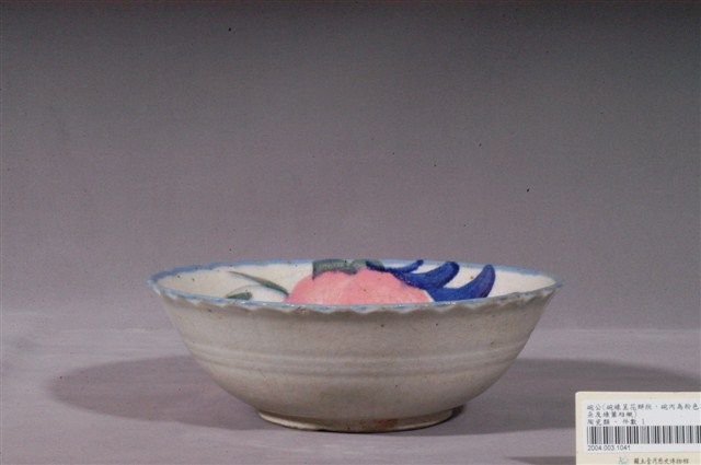 1.手繪青花粉紅彩花卉紋花口碗高溫燒製,並以模具成形。薄圓唇,敞口,弧壁,圓腹,大圈足,圈足露胎,胎色白中帶灰,胎質細膩但略有雜質,且有窯沙沾黏。全器施白釉,呈色略帶暖色調,器表有諸多氣孔、泛黃的現象,器表則是佈滿開片紋路。口沿施一道鈷藍釉並作向外開展的波浪花口狀,而外壁腹中間印弦紋三道。主要的盛開的花卉紋飾繪於碗心一側,並從側壁延伸出含苞待放的花蕾以及富有生命力的枝葉。整體以鈷藍、粉紅以及墨綠等三種彩釉作為主色調,輔以一圈搭配的鈷藍釉,配色清新雅緻。2.粉紅彩色料,其引進臺灣比釉下青花鈷料年代略晚,但