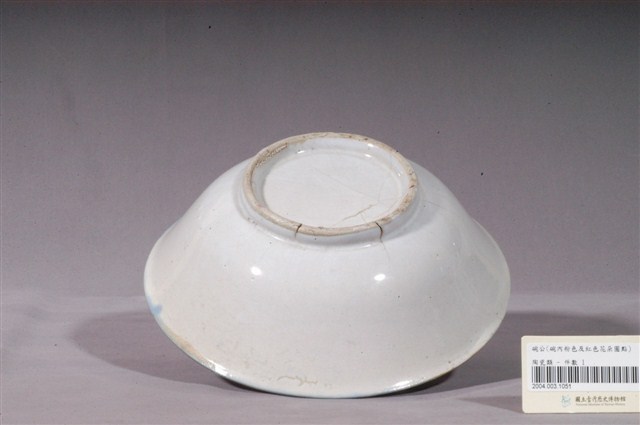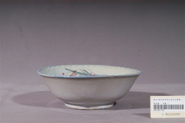 藍釉花卉紋淡青碗敞口微侈,圓弧壁下接圈足,壓模成形。大圈足,圈足露胎,胎色偏灰,胎質細緻。全器施以淡青色透明釉,釉色清透明亮,但略有不勻現象。器面光潔,而圈足處有幾道裂紋。器外壁素面無紋,口沿部分飾以一道二方連續的繩紋,並施塗一道清淡的藍釉。器內壁繪有寫意花卉紋,以兩朵淡粉紅花卉為主,輔以黃褐色及灰綠色的莖葉,植物線條流暢奔放,圖樣簡約,相較於口沿裝飾性強烈的線條紋,顯得清淡雅致,兩者各顯特色且相得益彰。戰後初期流行,俗稱為「淡青仔碗」的彩瓷飯碗。戰後初期流行的飯碗樣式之一,1950年代前後臺灣鶯歌窯製