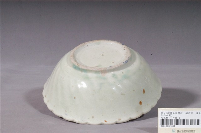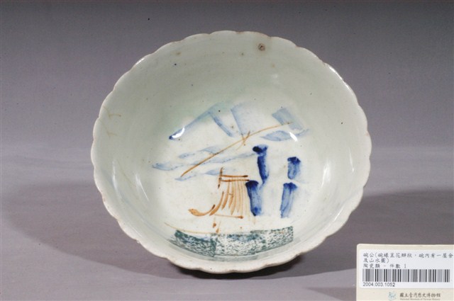 彩繪山水景緻花形碗以模具成形且高溫燒製而成。侈口,弧壁,淺圓腹,大圈足,圈足露胎,胎質細緻。全器施白釉,呈色帶青色調,釉面光潔,器表略有氣孔及裂痕。口沿向外開展的波浪花口狀,共二十七個波狀起伏,器外壁沿著波浪紋向下延伸出縱向的曲線。主要紋飾以碗內壁的圖案為主,以深淺的鈷藍釉、淺黃褐釉等為主要色調,紋樣的整體構圖鬆散,用筆極為抽象,依據此山水景緻花形碗系列作品的內容推測,此碗的圖樣應是描繪湖水、小屋以及綠草等景致。畫者以扁平的筆刷,簡略地刷出山脈、草地等色塊,再以數筆細線勾勒小屋,用最簡約的方式表現山水圖樣