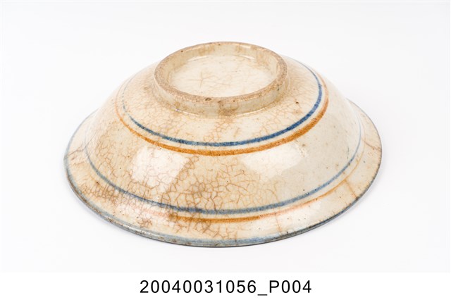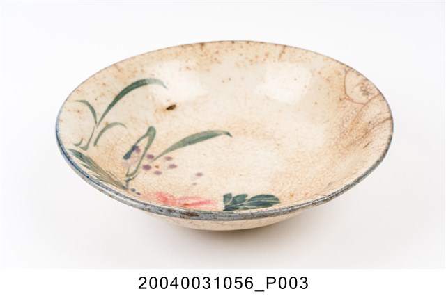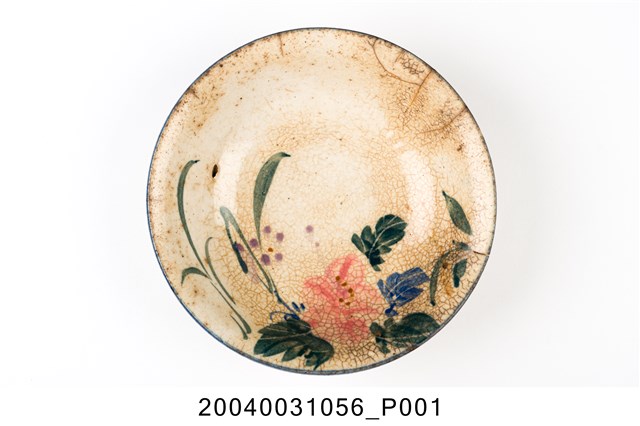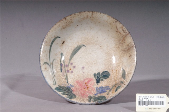 1.彩繪花卉紋碗高溫燒製,圓唇,敞口,弧壁,碗底較淺且寬,大圈足,圈足露胎,胎色偏灰,胎質細緻。全器施白釉,器表佈滿開片紋路、呈泛黃現象,且有諸多氣孔及數道裂紋。口沿處施一圈鈷藍釉。外壁上緣及下緣處各繪兩組藍色及褐色組合的弦紋。主要的花卉紋飾散繪於碗心一側。構圖主題為一朵盛開的粉紅花卉,並於四周延伸出小花及枝葉等,使觀者視線更加集中於花卉之上。花卉紋飾以粉紅釉為主要表現,淡紫色釉為輔,葉片的釉色則以墨綠釉及藍釉呈現之。筆法活潑自然,且葉片的繪製技巧頗具巧思,於上釉後再快速刮出細線作為葉脈,此細節更添植物葉