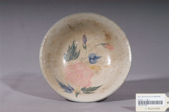 1.彩繪花卉紋碗高溫燒製,圓唇,敞口,弧壁,碗底較淺且寬,大圈足,圈足露胎,胎色白中帶灰,胎質細膩,略有窯沙沾黏。全器施白釉,呈色偏黃,器表有氣孔、開片紋路和積釉現象。口沿處施一圈極淡的鈷藍釉。外壁上緣繪一條藍色弦紋,下緣處則繪一組藍色及褐色組合的弦紋。主要的花卉紋飾散繪於碗心及側壁。構圖採由上而的俯瞰視角,主題是一朵盛開的粉紅花卉,並於四周增添含苞的花蕾、葉片及藤枝等。花卉紋飾以粉紅釉為主要表現,以淡紫色釉為輔,但花卉釉色發色較清淡,以至於輪廓並不清晰。葉片則以藍釉及褐釉表現之。 2.粉紅彩色料,其引