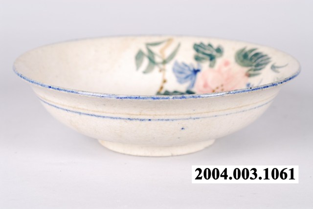 1.彩繪花卉紋碗高溫燒製,圓唇,敞口,弧壁,碗底較淺且寬,大圈足。全器施白釉,呈色略帶黃色調。口沿處施一圈鈷藍釉,呈色清淡。外壁上緣處及下緣處各繪兩組藍色及褐色組合的弦紋。主要的花卉紋飾散繪於碗心一側。構圖主題為一朵盛開的粉紅花卉,並於四周延伸出小花及枝葉等,使觀者視線更加集中於花卉之上。花卉紋飾以粉紅釉為主要表現,輔以淡紫色釉,葉片的釉色則跳脫傳統,除墨綠釉之外,更搭配藍釉及褐釉,增添色彩變化。筆法細膩謹慎,且葉片的繪製技巧頗具巧思,於上釉後再快速刮出細線作為葉脈,此細節更添植物葉片的質地表現,使整體紋