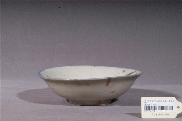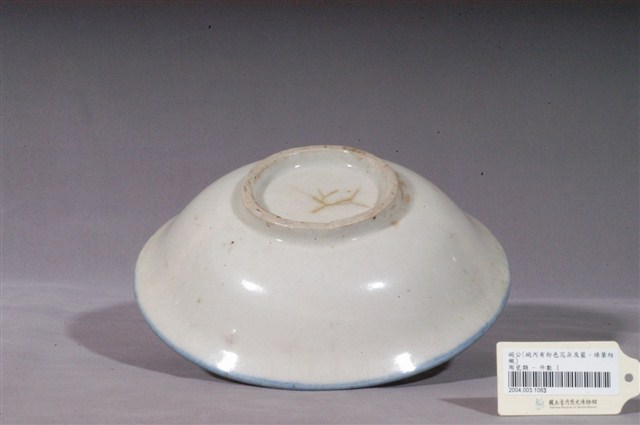 1.彩繪花卉紋碗高溫燒製,圓唇,敞口,弧壁,碗底較淺且寬,碗形因燒製而略有變形。大圈足,圈足露胎,胎色白中帶灰,胎質細膩無雜質,有些微窯沙沾黏情況。全器施白釉,呈色帶暖色調,器表略有氣孔,口沿處及圈足內皆有裂紋。口沿處施一圈淡鈷藍釉。外壁素面無紋。主要的花卉紋飾散繪於內壁各處。構圖採由上而的俯瞰視角,於碗心繪一朵盛開的粉紅花卉,並於四周增添葉片及藤枝等,使觀者視線更加集中於花卉之上。紋飾以粉紅釉為主要表現,葉片的釉色則跳脫傳統,搭配藍釉及褐釉。此外,葉片的繪製技巧頗具巧思,於上釉後再快速刮出細線作為葉脈,