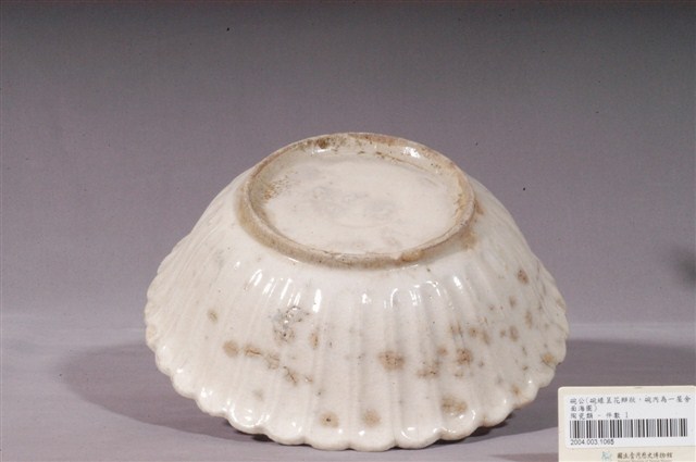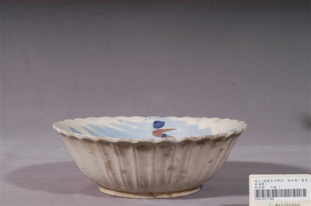 彩繪湖畔景緻花形碗以模具成形且高溫燒製而成。侈口,弧壁,淺圓腹,大圈足,圈足露胎,胎質略為粗糙。圈足因刮釉因此留下凹凸不平的痕跡,圈足底較不平整且有窯沙沾黏。全器施白釉,呈色帶暖色調,釉面光潔,器表有諸多氣孔、裂痕及泛黃的現象。口沿向外開展的波浪花口狀,共三十二個波狀起伏,器外壁沿著波浪紋向下延伸出縱向的稜脊,猶如一株盛開的花朵。主要紋飾以碗內壁的圖案為主,以鈷藍釉、淺黃褐釉、褐釉、綠釉等為主要色調,描繪湖水、漁船以及岸邊人家景緻。紋樣的整體構圖較為凌亂鬆散,用筆抽象寫意,僅以幾筆表達漁船、飛鳥等圖像。整