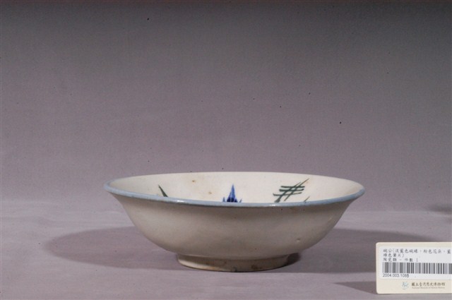 1.彩繪花卉紋碗以高溫燒製,口沿外敞,弧壁,圓腹,碗底較淺且寬,大圈足,圈足露胎,胎色米白,胎質較細,圈足周圍有沾黏窯沙。全器施白釉,呈色略帶青色調,釉面光潔。口沿施罩一圈淺藍色釉,碗外壁素面無紋。主要紋飾以碗內壁的圖案為主,以黛綠、粉紅、藍釉等色彩為主,描繪花朵以及枝葉。構圖簡約,筆法迅捷有力,線條表現豐富。2.花有富貴榮華的象徵意涵,因此是民間常見的裝飾紋樣。而胭脂紅釉亦是民間愛用的釉彩之一,經常與黛綠色釉搭配繪製,有相輔相成的效果。