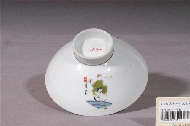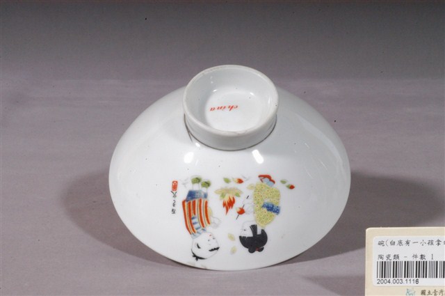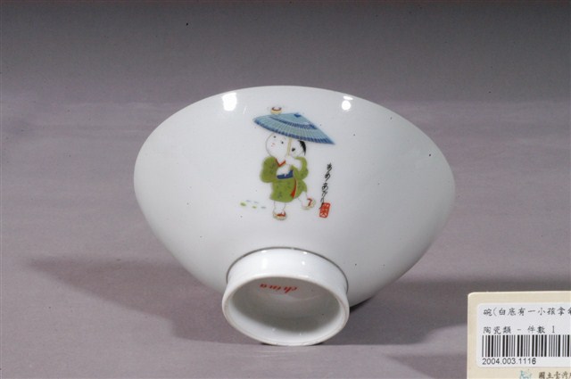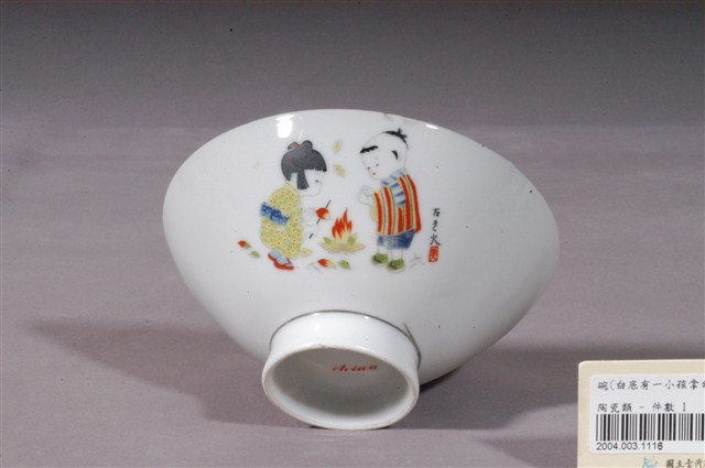 釉上彩嬰戲紋碗為模製成形,薄唇,平口,斜腹,弧壁下斂至圈足,高圈足,圈足露胎,薄胎,胎質細緻。全器施白釉,呈色白皙,清透光潔。內壁素面無紋飾。外壁以膠板印刷裝飾兩組嬰戲圖,其一,一位著日式和服、腳踩木屐的男孩,撐著一把藍色雨傘,傘上有陀螺正在打轉,男孩嘗試保持平衡不使其落下。其二,一對孩童,一男一女,亦著日式服裝,圍在營火旁,空中有樹葉飄落,男孩似伸手嘗試取暖,而女孩則手拿竹籤串起地上的果實。此件作品細節豐富,做工細緻精巧,配色鮮豔明亮,孩童的肢體動作栩栩如生,活潑可愛。兩組嬰戲圖旁皆書有日文,並於其下印