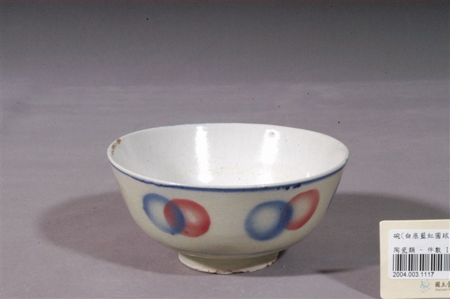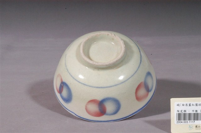紅藍彩圓圈紋碗敞口微侈,圓弧壁下接圈足,壓模成形,圈足刮釉露胎。器表略有開片細紋。內器壁素面無紋,施罩白釉,碗外壁與外器底則施以淡黃色釉。碗式與俗稱為「淡青仔碗」樣式的彩瓷飯碗相同,但彩飾技法開始推陳出新。碗外壁近口緣與近圈足處各裝飾一道青花線紋,兩道青花線紋之間裝飾五組紅藍圓圈交錯的花紋。彩飾方法採用噴釉,業者稱為「電花彩飾」的技法。1960年代之後臺灣鶯歌窯製品,亦是戰後1960年代以後流行的彩瓷飯碗樣式之一。