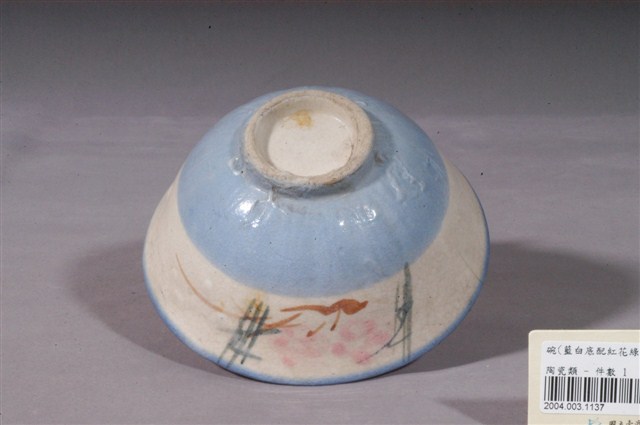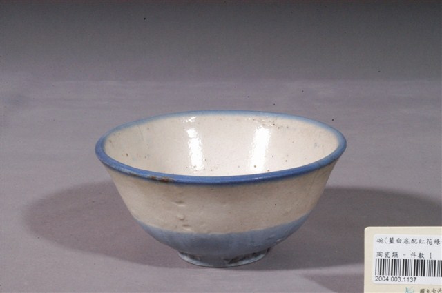 1.白釉藍白底紅花綠葉彩繪紋瓷碗,敞口,圓唇,圓腹下收接矮圈足。碗口口緣施罩一圈藍色釉彩;內壁施白釉,素面無紋;外壁上半部分以粉紅、綠、褐彩繪紅花綠葉圖案,筆法率性隨意。下半部分及圈足外壁滿施藍色釉彩。整體風格渾厚質樸。圈足底呈白色無落款,有因使用造成的褐色痕跡。2. 花卉是最常見的器物紋飾之一。粉紅彩色料,其引進臺灣比釉下青花鈷料年代略晚,但推測日治時期已經開始使用,以粉紅彩花朵加以青花枝葉做搭配是民窯產品經常見到的紋飾。日治時代至戰後初期,陶瓷工廠彩繪的工作通常由女工來負責,這些沒有受過職前訓練的女工每人專畫一部份,並負責不同的色彩。這種情形就好像生產線上的分工一樣,多人共同將一種工作完成。