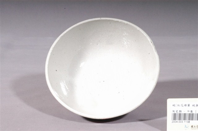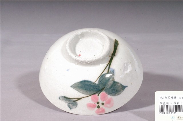 1.白釉紅花綠葉彩繪紋瓷碗,敞口,圓唇,圓腹下收接矮圈足,灰白胎。全器施白釉;內壁素面無紋;外壁則以彩繪勾勒出紅花綠葉圖案,花朵共分五瓣,呈淡粉色,簇擁著淺綠的花芯,花葉為深綠色,姿態舒展,筆法灑脫,筆觸濃淡合宜,頗具立體感,花莖為淺綠色,挺拔剛勁,線條俐落,整體風格寫意,洋溢著自然渾厚的趣味。碗外壁有撞凹痕,圈足內底呈白色無落款。2.花卉是最常見的器物紋飾之一。粉紅彩色料推測日治時期已經開始使用,以粉紅彩花朵加以枝葉做搭配是民窯產品經常見到的紋飾。日治時代至戰後初期,陶瓷工廠彩繪的工作通常由女工來負責,這些沒有受過職前訓練的女工每人專畫一部份,並負責不同的色彩。這種情形就好像生產線上的分工一樣,多人共同將一種工作完成。