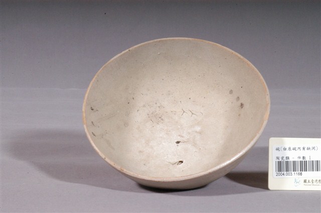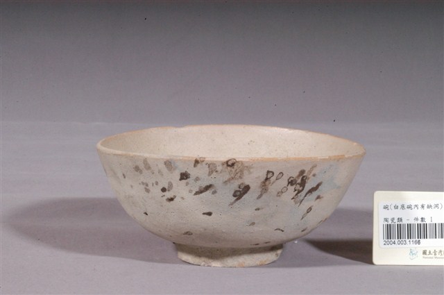 1.白釉黑點陶碗,敞口,圓唇,圓腹下收接矮圈足,圈足露胎,胎色橙黃,胎質略顯粗糙。全器厚胎薄釉,除圈足外皆施白釉,釉色偏灰,器表有許多氣孔。內壁氣孔略大,可見數處磕損痕跡,腹底有一缺洞;外壁有許多黑點,深淺不一,黑點下方隱見淺藍色釉彩;整體簡單粗疏。2.南投可能是臺灣最早生產陶器的地方,該地於道光元年(1821)設立頭、中、尾三窯生產日用陶器,到咸豐(1851–1861)年間已有相當規模。日治時期南投的窯業受到政府的重視,日用陶器生產也邁入黃金時期,足與鶯歌陶南北輝映,有名的「南投燒」就是指這段時期南投所產的細工陶器。 不過戰後初期南投燒制的陶器仍以粗陶為主,且素燒比釉燒更為普遍。釉燒之釉藥,多半為草灰與泥漿,土援練製,但求不漏水即可。本件藏品為粗陶器。