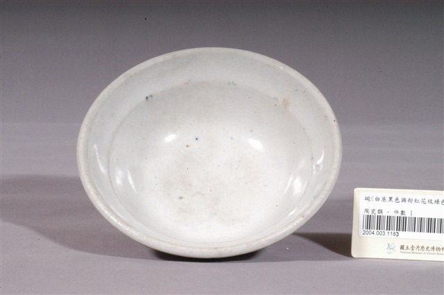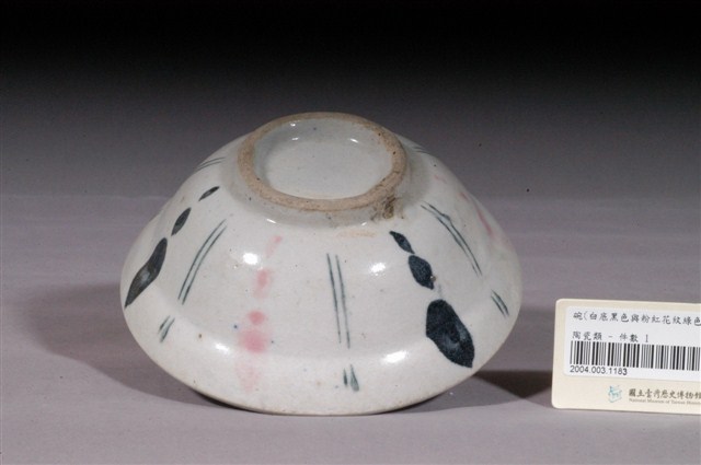 1.白釉黑粉幾何彩繪紋瓷碗。敞口,圓唇,折沿,圓腹下收接矮圈足。全器施白釉;釉色光潔;內壁素面無紋;外壁以雙條綠豎紋分隔開,中間以綁在一起的竹篦沾黑色及粉紅色染料刷到坯上,彩繪出下細上粗的點狀幾何花紋,筆法簡單隨意;圈足底刮釉露胎,內底呈白色無落款。2.早期鶯歌的產品都用雕刻、壓印的方式做裝飾,開始生產碗盤之後才用手繪作紋飾。幾何紋圖案的特色是工整、規律而容易表現,手繪的紋飾則有意想不到的變化及美感。幾何形紋飾日治時期就非常流行,這種最簡單而易於操作的圖案可能也是陶瓷器皿上最早應用的紋飾。