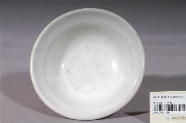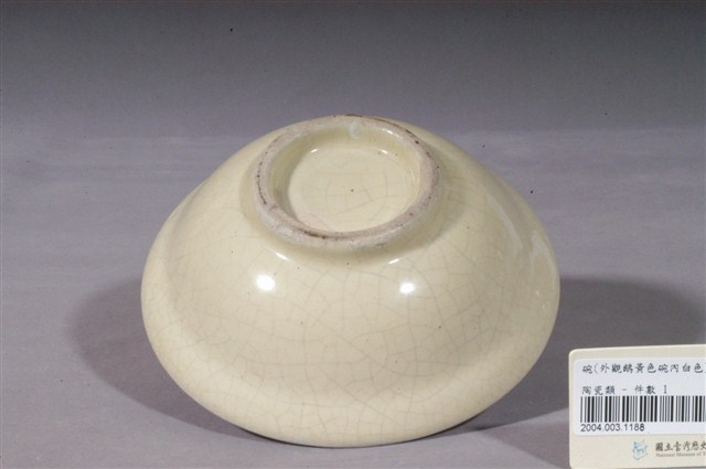 1.鵝黃釉瓷碗,敞口,圓唇,折沿,淺弧腹,矮圈足。碗內壁施白釉,外壁施鵝黃釉,均可見釉面開片形成的細碎紋路,圈足刮釉露胎,內底呈鵝黃色無落款。2.開片本為瓷器釉面的一種自然開裂現象,開裂的常見原因有二:一是器物成型時坯泥只在單一方向延伸,影響了分子的排列,燒結時應力不均衡;二是坯體與釉料的熱膨脹系數相差較大,焙燒後冷卻時釉層收縮率大。其最初是陶瓷工藝的一種缺陷,因為如果釉面完全開裂,就會形成縮釉以及脫釉。後來人們掌握了開片的規律,開片即被利用作為一種釉面裝飾。