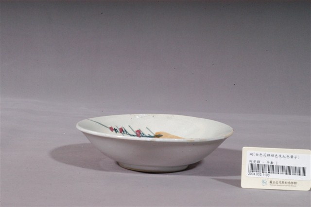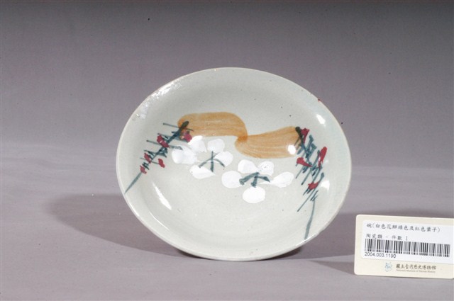 1.青釉白花紅果綠葉彩繪紋瓷碗,撇口,圓唇,淺弧腹,矮圈足。碗外壁施白釉,素面無紋;內壁施青釉,釉色偏白。内壁彩繪有白花紅果綠葉圖案,白花分為五瓣,花芯點綴綠色花蕊,花朵周圍以綠色線條象徵花葉,花葉間綴有紅果,下方還有兩片咖啡色闊葉,整體色彩豐富,風格簡約素雅。2花卉是最常見的器物紋飾之一。以隨意的幾撇畫上類似花朵、葉子的符號,是民窯產品經常見到的紋飾。日治時代至戰後初期,陶瓷工廠彩繪的工作通常由女工來負責,這些沒有受過職前訓練的女工每人專畫一部份,並負責不同的色彩。這種情形就好像生產線上的分工一樣,多人共同將一種工作完成。