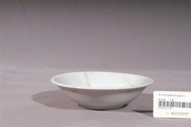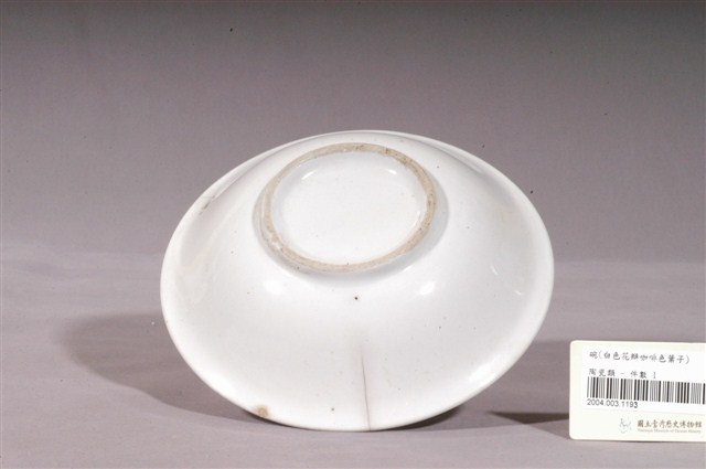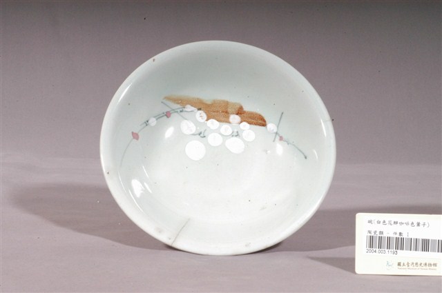 1.青釉白花咖啡葉彩繪紋瓷碗,撇口,圓唇,淺弧腹,矮圈足,器身有一道裂痕。碗外壁施白釉,素面無紋;內壁施青釉,釉色偏白,內壁彩繪有花葉圖案,兩朵白花位於碗心邊緣處,花分五瓣,花芯有綠色花蕊,小巧玲瓏,十分可愛,白花周圍以褐色花葉和綠色花莖作為襯托,花莖上還有象徵小花的紅白圓點,整體清新秀麗,風格簡約素雅。圈足底刮釉露胎,內底呈白色無落款。2.花卉是最常見的器物紋飾之一。以隨意的幾撇畫上類似花朵、葉子的符號,是民窯產品經常見到的紋飾。日治時代至戰後初期,陶瓷工廠彩繪的工作通常由女工來負責,這些沒有受過職前訓練的女工每人專畫一部份,並負責不同的色彩。這種情形就好像生產線上的分工一樣,多人共同將一種工作完成。