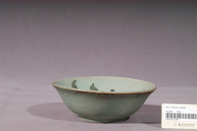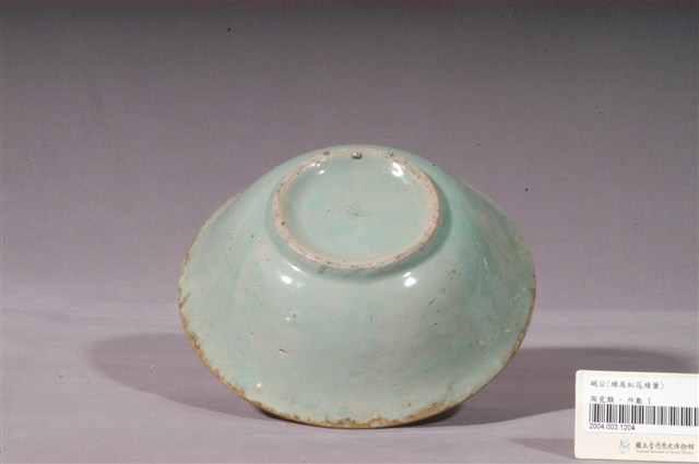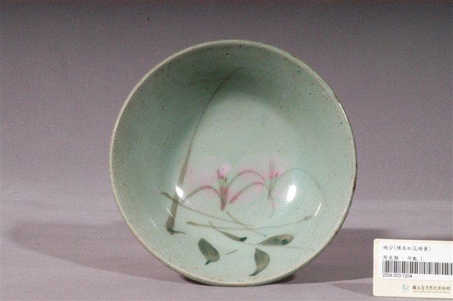 1.青釉紅花綠葉彩繪紋瓷碗,撇口,圓唇,淺弧腹,矮圈足。全器施青釉,釉色不均勻。器表有許多氣孔。碗外壁素面無紋,唯口沿處有咖啡色雜質沈澱;內壁彩繪有紅花綠葉紋樣,紅花位於碗心,花瓣的粉紅釉彩已經十分淺淡,輪廓模糊,不過綠色的花蕊與紅花四周作為陪襯的莖葉仍然十分清晰,線條流暢,風格簡約。圈足刮釉露胎,內底呈青色無落款。2.花卉是最常見的器物紋飾之一。以隨意的幾撇畫上類似花朵、葉子的符號,是民窯產品經常見到的紋飾。日治時代至戰後初期,陶瓷工廠彩繪的工作通常由女工來負責,這些沒有受過職前訓練的女工每人專畫一部份,並負責不同的色彩。這種情形就好像生產線上的分工一樣,多人共同將一種工作完成。