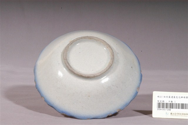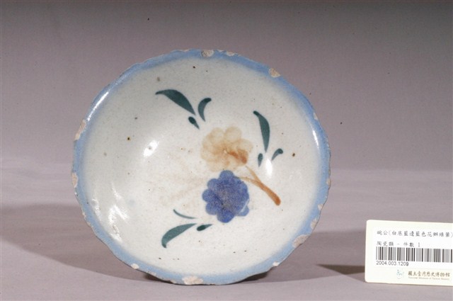 1.白釉藍邊紅藍花綠葉彩繪紋瓷碗,敞口,圓唇,淺弧腹,矮圈足。全器施白釉,釉色光潔。口沿處塗成藍邊,有多處磕碰造成的露胎。碗外壁素面無紋;內壁彩繪有花葉圖案,碗心邊緣處彩繪有兩朵相映成趣的紅藍並蒂花,花瓣交疊,深淺有致,頗具立體感,花朵周圍還以三處細長綠葉作為陪襯,更顯雅緻。圈足刮釉露胎,內底無落款。2.花卉是最常見的器物紋飾之一。日治時代至戰後初期,陶瓷工廠彩繪的工作通常由女工來負責,這些沒有受過職前訓練的女工每人專畫一部份,並負責不同的色彩。這種情形就好像生產線上的分工一樣,多人共同將一種工作完成。
