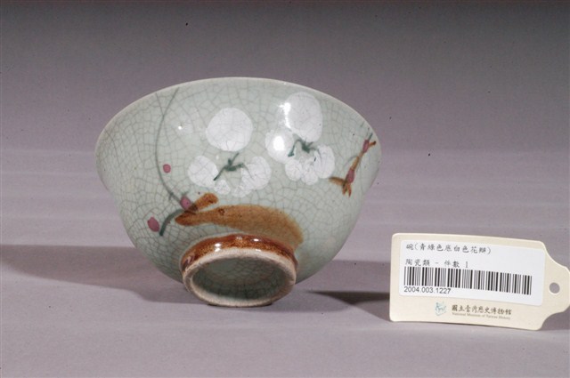 1.青釉白花綠葉紅果彩繪紋瓷碗,敞口,圓唇、圓腹下收,具矮圈足。碗內壁施白釉,素面無紋;外壁施青釉,釉色偏白,釉面開片。壁身彩繪有白花綠葉紅果圖案,兩朵白花皆為五瓣,花芯點綴綠色花蕊,花朵周圍以綠色與褐色線條象徵枝葉,花葉間還綴有紅果,整體色彩豐富,風格簡約素雅。圈足底刮釉露胎,外壁繪有一圈褐色弦紋,內底呈青色無落款。2花卉是最常見的器物紋飾之一。以隨意的幾撇畫上類似花朵、葉子的符號,是民窯產品經常見到的紋飾。日治時代至戰後初期,陶瓷工廠彩繪的工作通常由女工來負責,這些沒有受過職前訓練的女工每人專畫一部份,並負責不同的色彩。這種情形就好像生產線上的分工一樣,多人共同將一種工作完成。