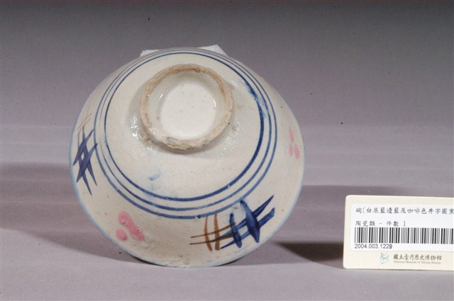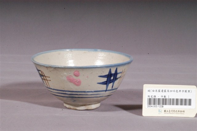 1.白釉藍邊幾何彩繪紋瓷碗,敞口,圓唇,圓腹下收接矮圈足。全器施白釉,釉色光潔。口沿處塗成藍邊。碗內壁素面無紋。外壁上壁彩繪有兩處雙井字幾何紋,雙井字幾何紋左側井字較大,呈藍色,右側井字較小,呈咖啡色,其間以三點粉紅色圓點作為襯托;下壁彩繪有三道藍色弦紋。圈足底刮釉露胎,內底呈白色無落款。2.幾何紋圖案的特色是工整、規律而容易表現。早在日治時期幾何形紋飾就非常流行,這種最簡單而易於操作的圖案可能也是陶瓷器皿上最早應用的紋飾。
