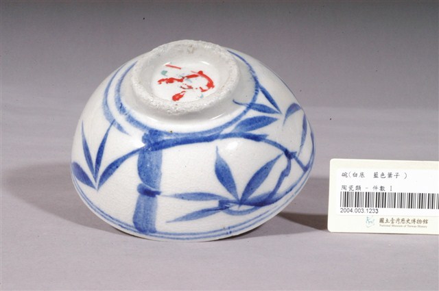 1.青花竹紋碗,敞口,弧壁下收,圓腹,底有圈足,以模具成形,施鈷料彩繪裝飾後高溫燒製而成。全器施白釉,碗內外壁細小開片,圈足略有缺損,釉面凹凸不平。碗內壁素面無紋,碗心與口沿有少許褐色斑點,碗外壁口沿下方裝飾青花雙線細弦紋,腹部下方近圈足處亦以青花弦紋裝飾,其中一道弦紋僅裝飾一半,非完整一圈,腹部中段以青花描繪竹幹與竹葉紋,相連的竹枝頗似纏枝紋構圖結構的應用。碗底心有紅漆符號,可能為飲食業者的標記。2.碗的形制有分較大、臺灣民間俗稱「碗公」的湯碗和形制較小的飯碗。本物件屬於形制較小的飯碗,碗壁上手繪的竹葉紋為鶯歌碗盤中常見的紋飾,從日治時期一直沿用到光復以後,竹子為松、竹、梅歲寒三友之一,象徵著文人的高尚志節。