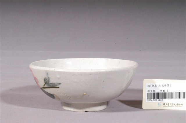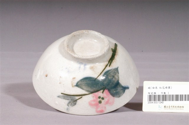 1.彩繪折枝花卉紋碗,敞口,口沿微斂,弧壁下收,圓腹,底有圈足,以模具成形,於白色長石釉上裝飾彩釉之後,高溫燒製而成。全器滿釉,表面帶有氣孔與雜質斑點,碗外壁細小開片,腹部有小圓點狀凸起。碗內壁素面無紋,碗外壁一側以深綠、黛綠、粉紅釉彩手繪折枝花卉,葉片飽滿,花朵色彩鮮豔,沒骨筆法純熟自然。2.粉紅彩紋飾經常出現在鶯歌碗盤中,這種釉彩的應用在日治時期已開始流行,戰後仍沿用許久。粉紅彩傳入臺灣後,臺灣北部窯廠紛紛開始模仿,由於鶯歌窯的發展在北投窯之後,當時許多北投窯的工人遷居到鶯歌,同時將紋飾帶去,因此推測粉紅釉彩的流行也是從北投傳到鶯歌。