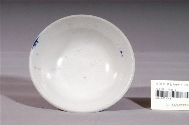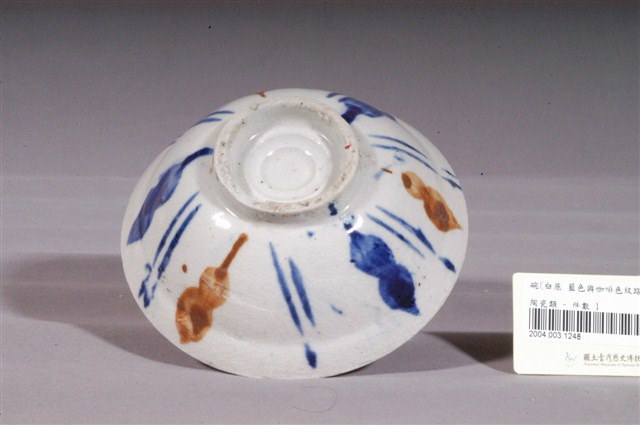 1.青花褐彩生意碗,撇口,折沿,碗外壁口緣下方作一內凹折痕,折痕以下呈圓弧形下收,底有圈足。以模具成形,施釉彩繪裝飾後高溫燒成。全器施白釉,碗內外壁細小開片,圈足底露胎,胎色米白。碗底心特意壓印二道同心弦紋,增添造型變化。碗內壁素面無紋,口沿與折痕上方有幾處青色斑點,應為彩繪施作時不小心沾到鈷料所致,碗外壁用青花與褐彩裝飾,以外底心為中心,呈放射狀繪製雙線紋將碗身分成六等份,雙線中間以青色和褐色交錯妝點水滴形與直線組成的長條色塊。2.生意碗為小吃攤喜愛使用,業者稱為「生意碗」的小吃碗,常見於滷肉飯、肉圓、肉羹等小吃攤。它的形制相當特別,通常胚體厚重,外折的口沿使碗面看起來比一般飯碗大,但碗的下半部向內收縮,碗身也淺,因此在視覺及重量上會讓客人覺得食物份量很多,但實際盛裝的並不多。